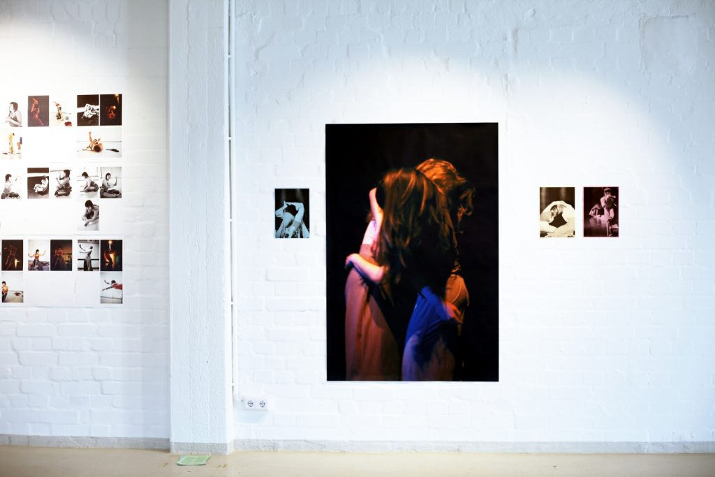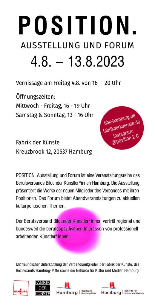 Ausstellungsflyer mit pinkem Punkt und den Namen der Ausstellung: POSITION.
